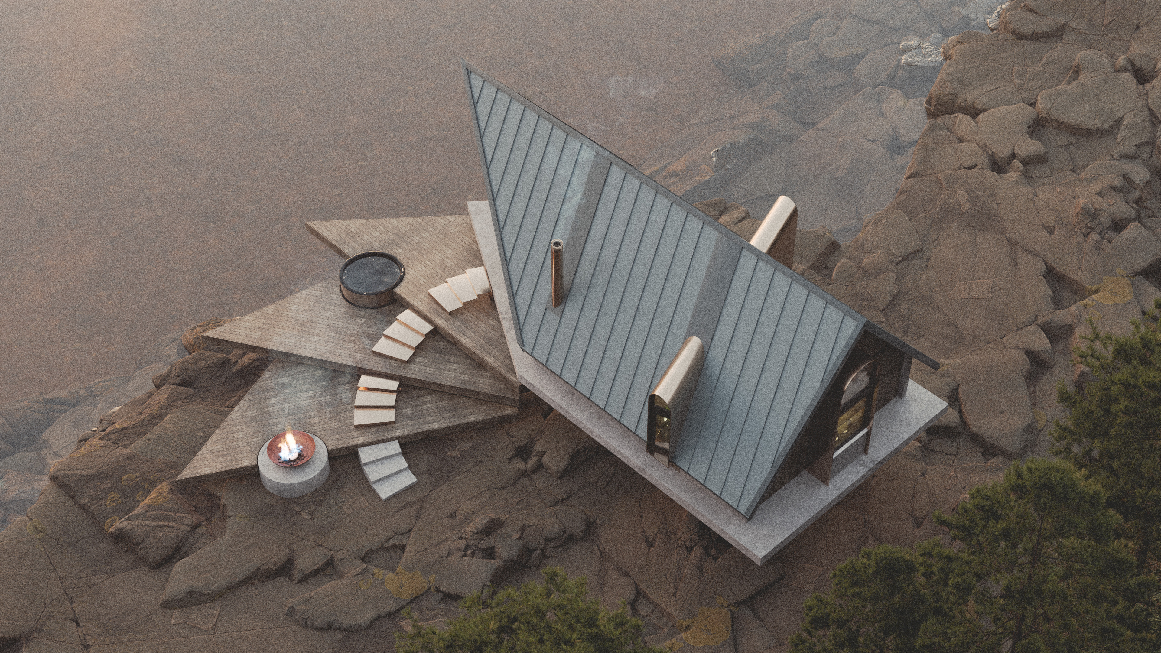 The exterior visualisations place the LittleBurtle Cabin in its intended context—a tranquil forest setting where architecture and nature coexist. The renders highlight the interplay of form and material: the dramatic, birdhouse-inspired roofline creates a striking silhouette against the trees, while the palette of standing-seam metal, warm wood, and board-formed concrete grounds the structure in its environment. The elevated design and expansive terrace demonstrate the cabin's light touch on the land and its seamless connection to the outdoors.