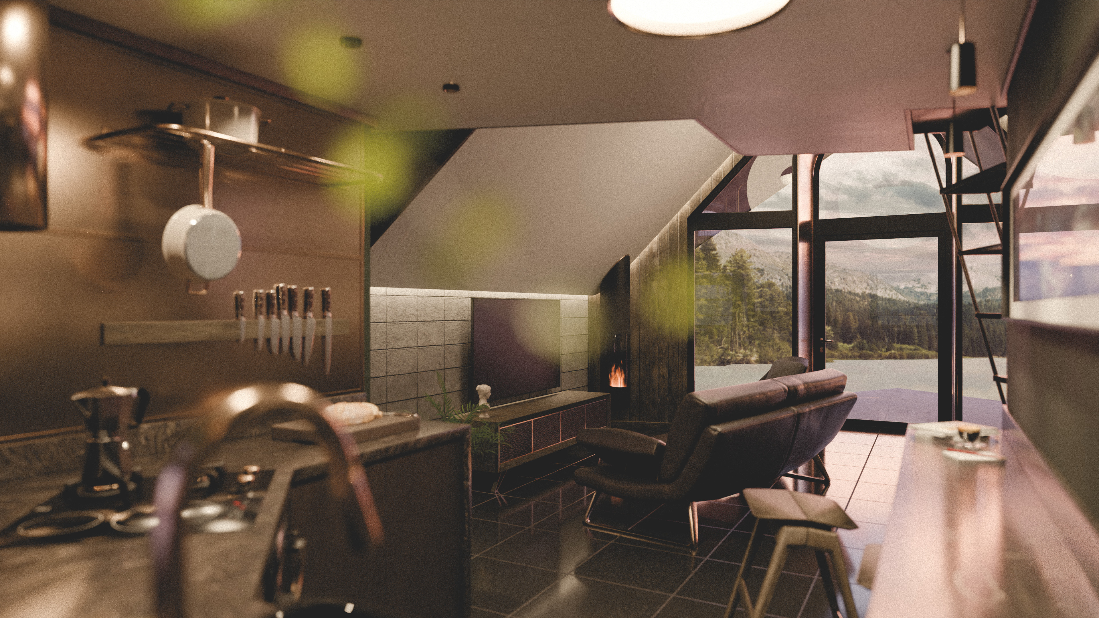 The interior of LittleBurtle is designed to be a sanctuary—a single, flowing space that feels both intimate and open. A palette of dark, warm tones, rich textures, and metallic copper accents creates a moody yet inviting atmosphere, perfect for a forest retreat. Every element is curated to maximise functionality within the compact footprint, from the integrated kitchen to the living area. The sleeping loft, accessed by a minimal ladder, serves as a serene, nest-like alcove, reinforcing the cabin's concept as a personal sanctuary.